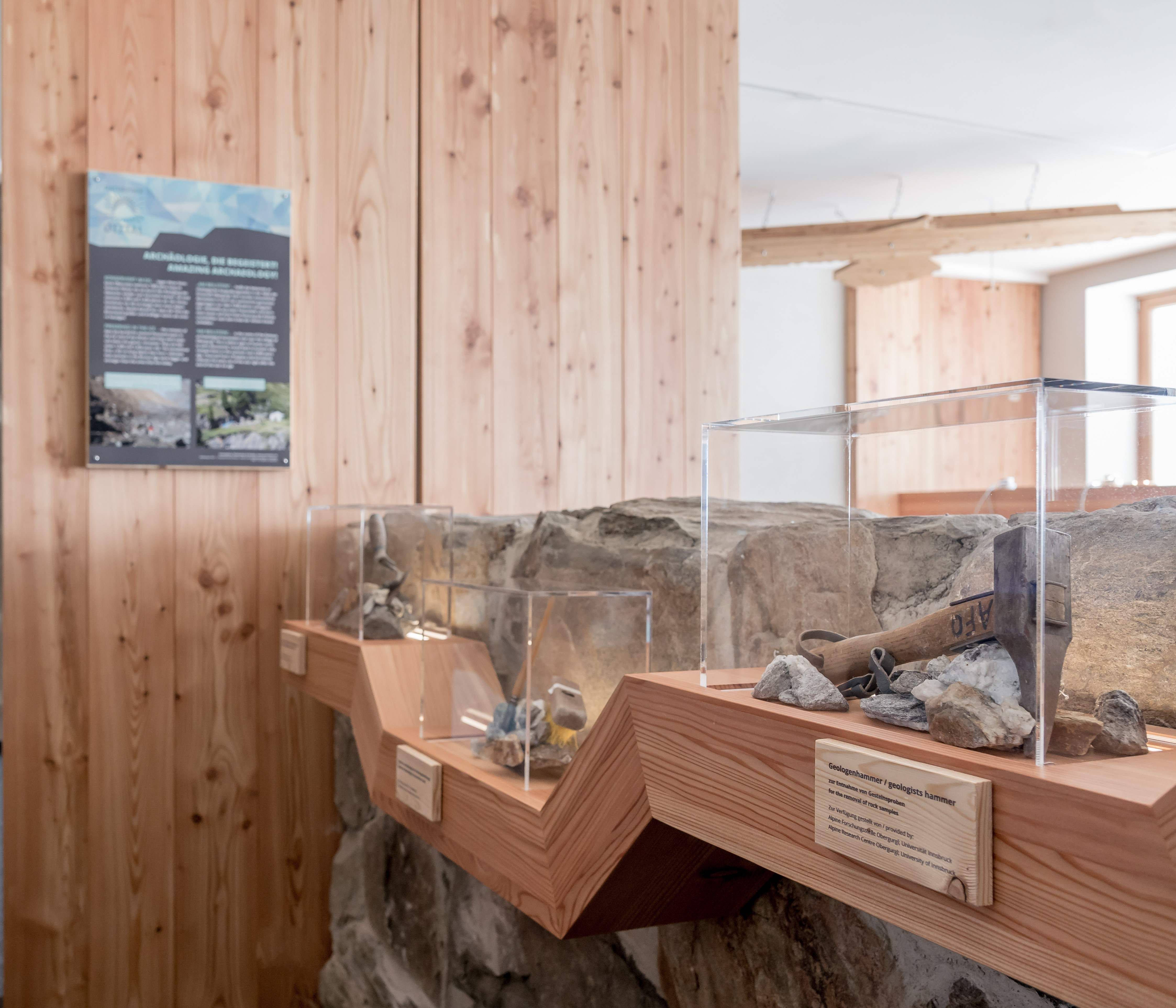 The 135m2 exhibition room welcomes visitors with a fascinating, expansive view through the open window front facing south to the glaciated valley heads of the Rotmoos and Gaisberg valleys. The colorful diversity of the Obergurgl stones can be found as a cross-sectional theme on the high-quality natural stone walls.